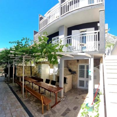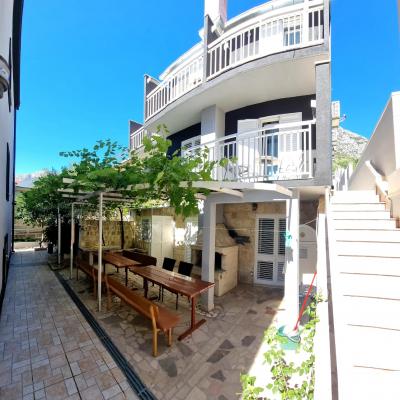 ROOM TYPES: All rooms in the villa B are air-conditioned, with a balcony / terrace, SAT/TV, bath /shower /toilet, hair dryer, signal WiFi. Ground floor - DBL - double room - with double bed and a terrace which is covered with vines. Beside is a room for 4-5 pax with double bed, 2 separates beds and the possibility of another 1 extra beds, a large front terrace with a table, benches and a barbecue. First floor: 2 rooms with four beds - one room with double bed and one with 2 single beds, the balcony. Second floor: 5 x DBL - double room with double bed of which 3 rooms with a partial sea view and 2 rooms have a look at the hills. In the rooms there is a possibility for extra bed but only suitable for children up to approximately 10 years old and we recommend to concluded a bed during the day.
